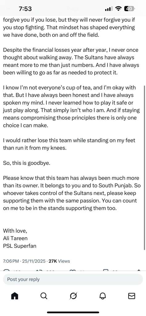 پاکستان سپر لیگ کی مقبول ترین فرنچائز ملتان سلطانز کے سابق مالک علی خان ترین نے ایک بھرپور اور جذباتی پیغام کے ذریعے ٹیم سے اپنی رخصتی کا اعلان کیا۔ یہ پیغام انہوں نے سوشل میڈیا پلیٹ فارم X (ٹوئٹر) پر جاری کیا، جس نے مداحوں کے دلوں میں ایک گہرا تاثر چھوڑا۔